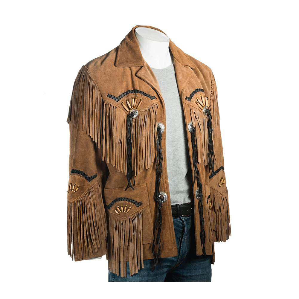 Western fringe jackets are a style of outerwear inspired by traditional cowboy and Native American attire. Typically made from leather or suede, these jackets feature decorative fringe along the sleeves, back, and chest. The fringe was originally practical, helping to wick away rain and dry the jacket faster, but today it serves primarily as a stylish nod to Western fashion. Often adorned with conchos, embroidery, or other Western details, fringe jackets add a bold, rustic charm to modern outfits.